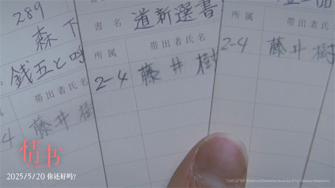 电影《情书》讲述了渡边博子(中山美穗 饰)给去世的前未婚夫藤井树寄出一封本该没有回应的书信,却意外收到一位署名为“藤井树”的女孩(酒井美纪 饰)回信;在二人的书信往来中,女孩藤井树逐渐发现,与她同名同姓的少年藤井树(柏原崇 饰)曾对自己暗藏一腔柔情,而渡边博子也在过程中与过往感情和解告别的故事。