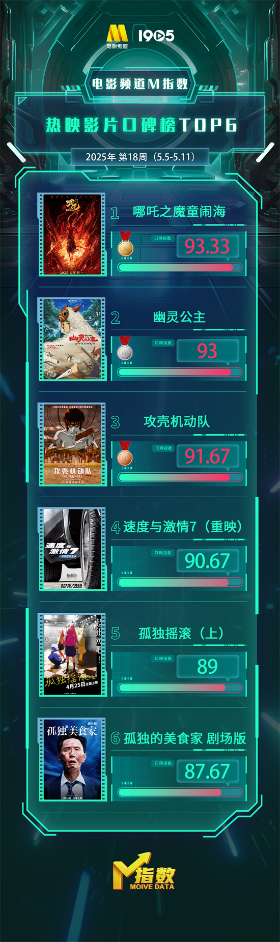 1905电影网讯 “电影频道M指数”2025年第18周结果发布。5月5日-5月11日,“电影频道M指数”热映影片口碑榜前6位依次为:
