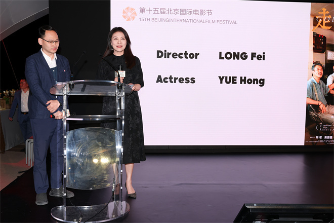 《走走停停》导演龙飞与演员岳红上台发言