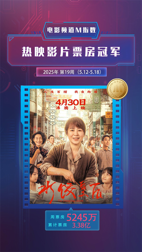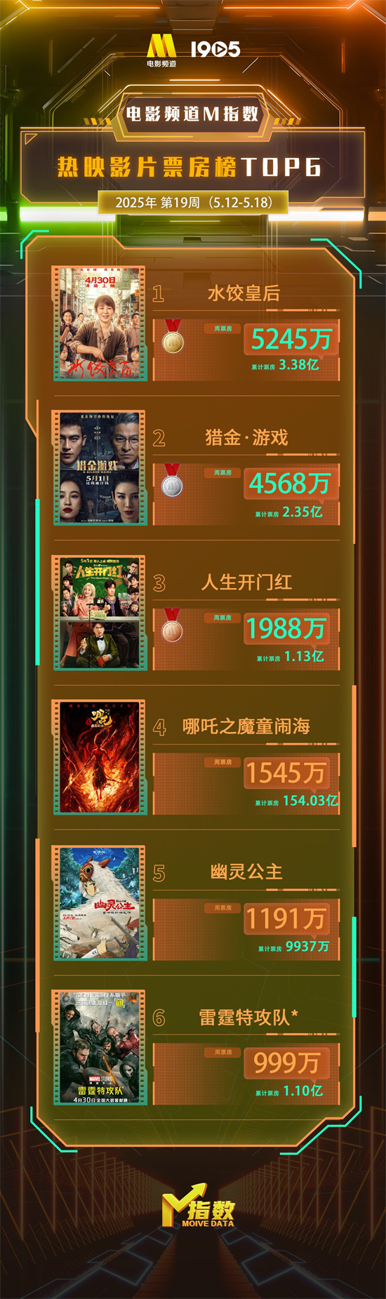 1905电影网讯 “电影频道M指数”2025年第19周结果发布。5月12日-5月18日,“电影频道M指数”热映影片票房榜前6位依次为: