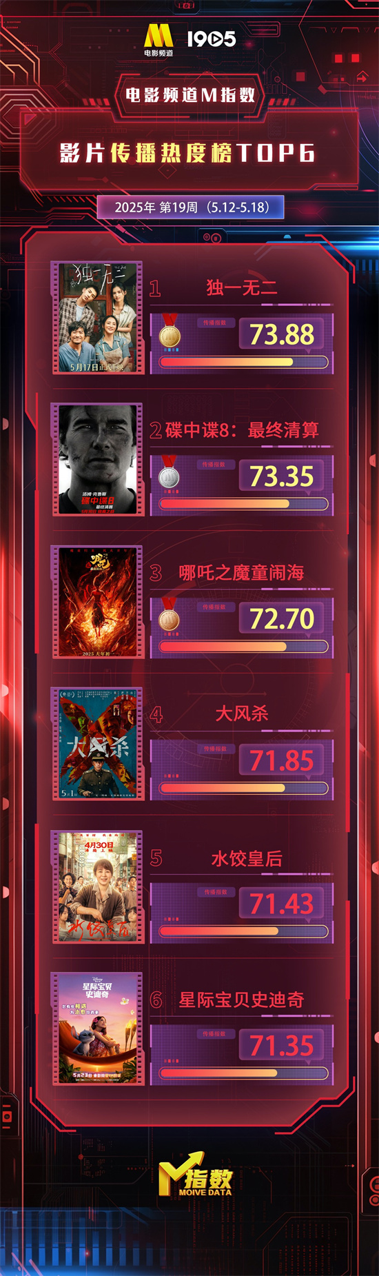 1905电影网讯 “电影频道M指数”2025年第19周结果发布。