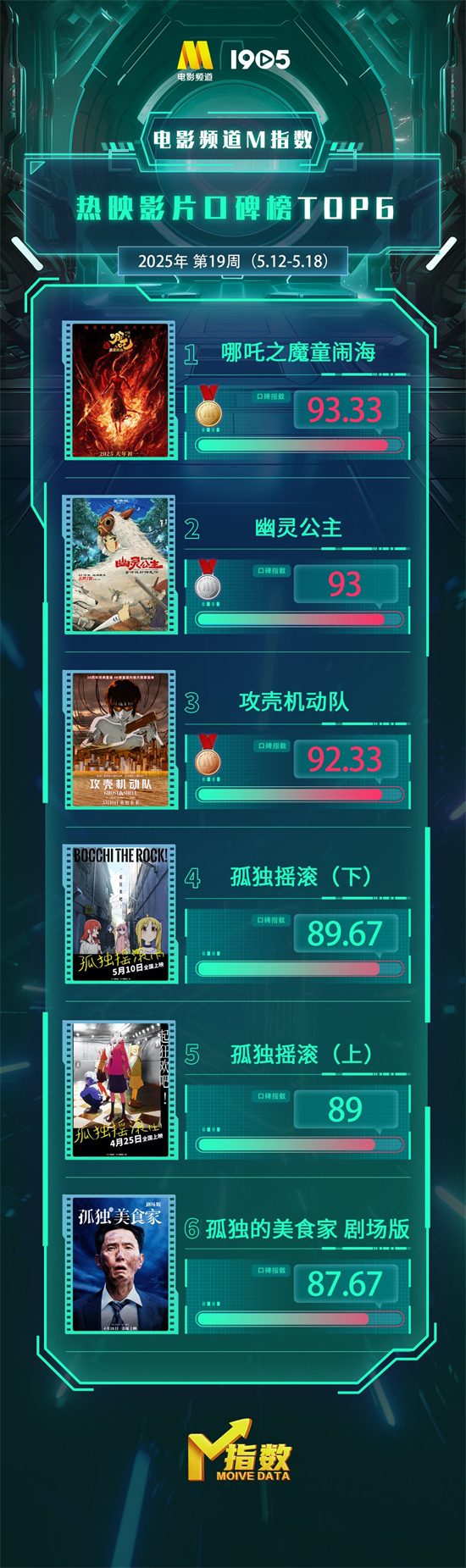 1905电影网讯 “电影频道M指数”2025年第19周结果发布。5月12日-5月18日,“电影频道M指数”热映影片口碑榜前6位依次为: