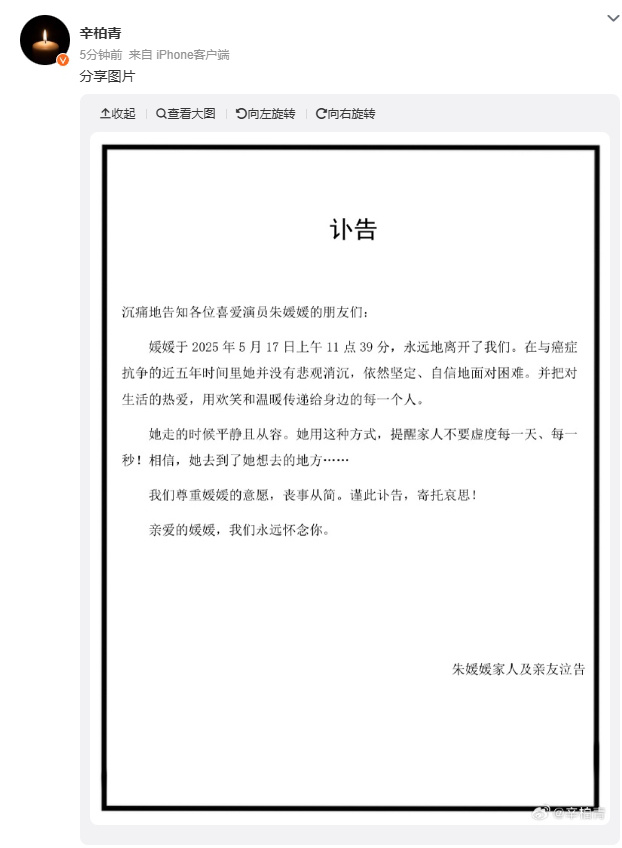 朱媛媛因癌症去世,享年51岁!丈夫辛柏青发讣告