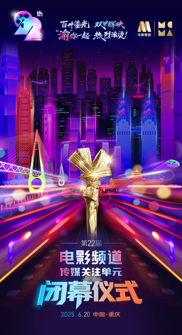 1905电影网讯 百卅鎏光,双甲辉映;“渝”你一起,热烈滚烫!第22届电影频道传媒关注单元将于山城重庆盛大启幕,主视觉海报传递“传媒荣誉聚焦赛博重庆,在8D魔幻时空遇见时代光影”概念。